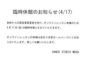政府からの緊急事態宣言を受け、オンラインレッスン準備のため 4月17日(金)は臨時休館とさせていただきます。 オンラインレッスンの詳細は決まり次第ホームページにてお知らせいたします。 宜しくお願いいたします。