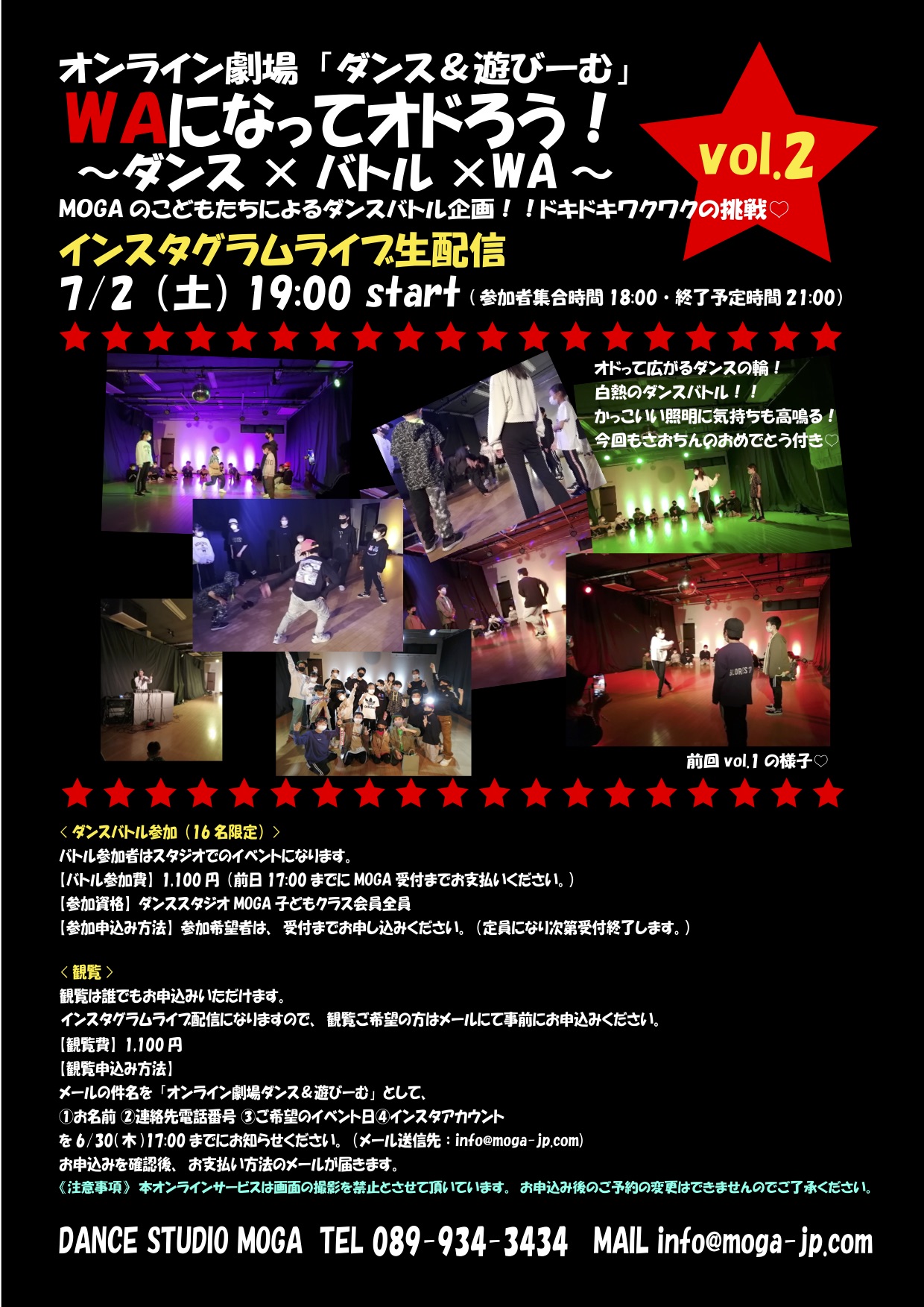 メールの件名を「オンライン劇場ダンス&遊びーむ」として、①お名前 ②連絡先電話番号 ③ご希望のイベント日④インスタアカウントを6/30(木)17:00までにお知らせください。(メール送信先:info@moga.sakura.ne.jp)