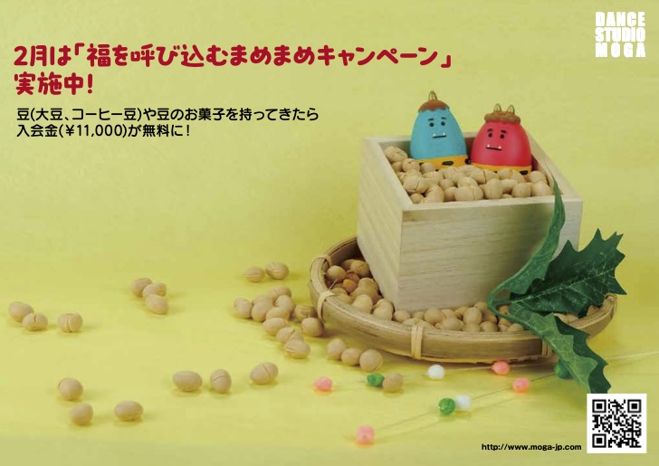 春よ来い来い!ダンスで彩る心と身体♡2月は「福を呼び込むまめまめキャンペーン」実施中!! 豆(大豆、コーヒー豆)や豆のお菓子を持ってきたら入会金(¥11,000 )が無料に!!今月もハッピーに踊っていきましょう♡