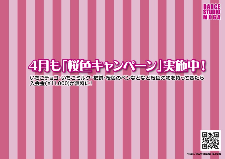 春よ来い来い!ダンスで彩る心と身体♡4月も「桜色キャンペーン」実施中!いちごチョコ・いちごミルク・桜餅・桜色のペンなどなど桜色の物を持ってきたら入会金(¥11,000)が無料に!今月もハッピーに踊っていきましょう♡