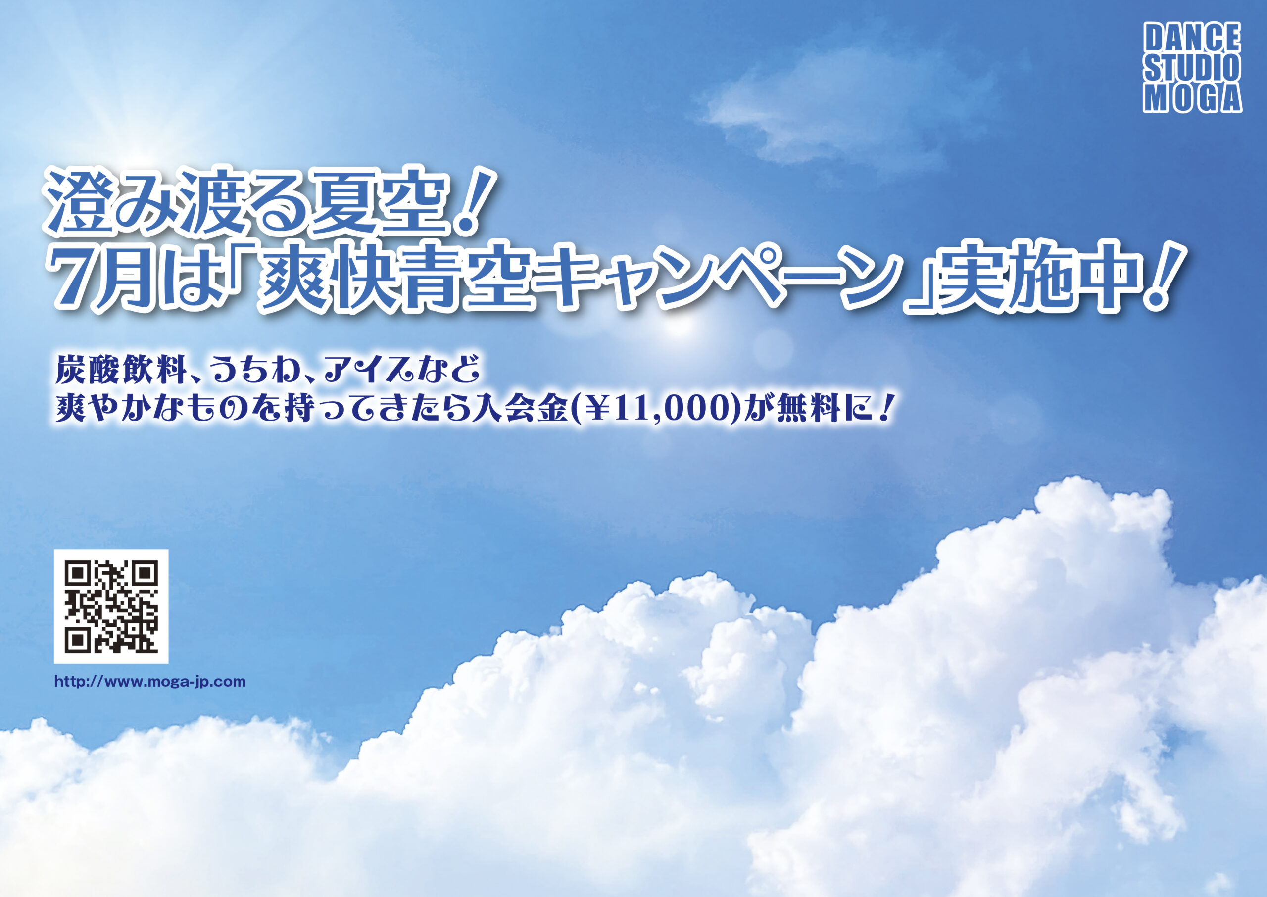7月は「爽快青空キャンペーン」実施中!炭酸飲料、うちわ、アイスなど爽やかなものを持ってきたら入会金(¥11,000)が無料に!今月もハッピーに踊っていきましょう♡