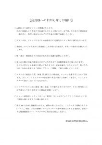 ●来館時、スタジオ入室時に消毒液による手指の消毒及び、手洗いの徹底をお願いいたします。