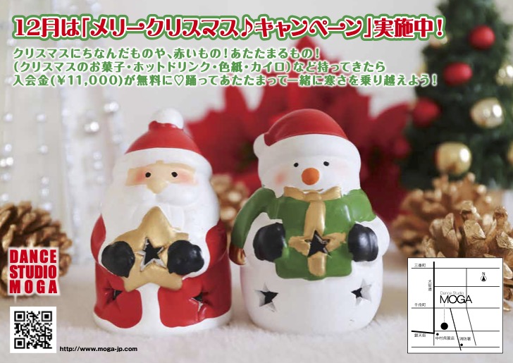冬到来!ダンスで心も身体もポカポカに♡12月は「メリークリスマス♪キャンペーン」実施中!クリスマスにちなんだものや、赤いもの!あたたまるもの!(クリスマスのお菓子・ホットドリンク・色紙・カイロ)など持ってきたら入会金(¥11,000)が無料に♡踊ってあたたまって一緒に寒さを乗り越えよう!