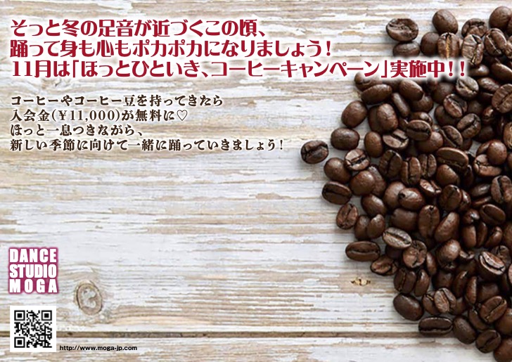 11月は「ほっとひといき、コーヒーキャンペーン」実施中!!!コーヒーやコーヒー豆を持ってきたら入会金(¥11,000)が無料♡ほっと一息つきながら、新しい季節に向けて一緒に踊っていきましょう!