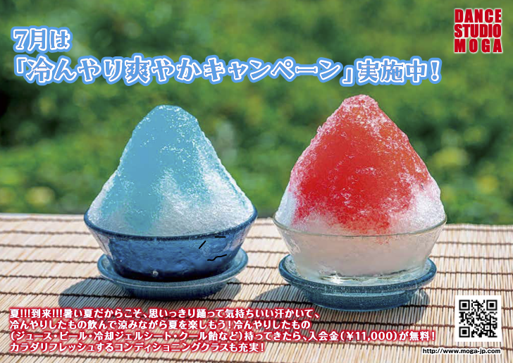 7月は「冷んやり爽やかキャンペーン♡」夏!!!到来!!!暑い夏だからこそ、思いっきり踊って気持ちいい汗かいて、冷んやりしたもの飲んで涼みながら夏を楽しもう!冷んやりしたもの(ジュース・ビール・冷却ジェルシート・クール飴など)持ってきたら入会金(¥11,000)が無料!!カラダリフレッシュするコンディショニングクラスも充実!