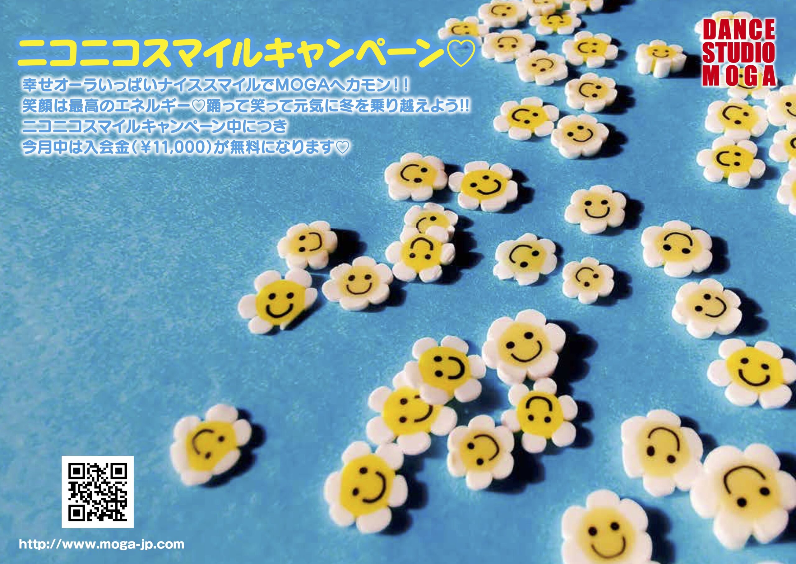 2月キャンペーンは「ニコニコスマイルキャンペーン♡」幸せオーラいっぱいナイススマイルでMOGAへカモン!!笑顔は最高のエネルギー♡踊って笑って元気に冬を乗り越えよう!!ニコニコスマイルキャンペーン中につき今月中は入会金(¥11,000)が無料になります♡