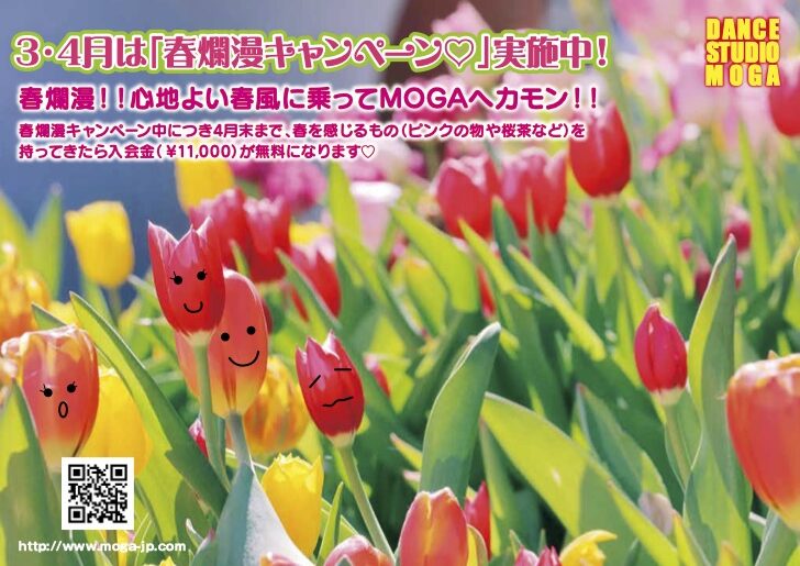 3・4月は「春爛漫キャンペーン♡』春爛漫!!心地よい春風に乗ってMOGAへカモン!!春爛漫キャンペーンにつき4月末まで、春を感じるもの(ピンクの物や桜茶など)を持ってきたら入会金(¥11,000)が無料になります♡