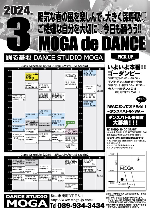 HIPHOPやJAZZからコンテンポラリーまで、魅力溢れる講師陣による充実したレッスンを行っています!きっとあなたにピッタリのダンスレッスンが見つかるはず!降り注ぐ音楽を身体で味わいながら、踊る喜びをあじわいましょう!ぜひぜひお待ちしています!(※初めての人のためのクラスもあります)3・4月は「春爛漫キャンペーン♡』春爛漫!!心地よい春風に乗ってMOGAへカモン!!春爛漫キャンペーンにつき4月末まで、春を感じるもの(ピンクの物や桜茶など)を持ってきたら入会金(¥11,000)が無料になります♡