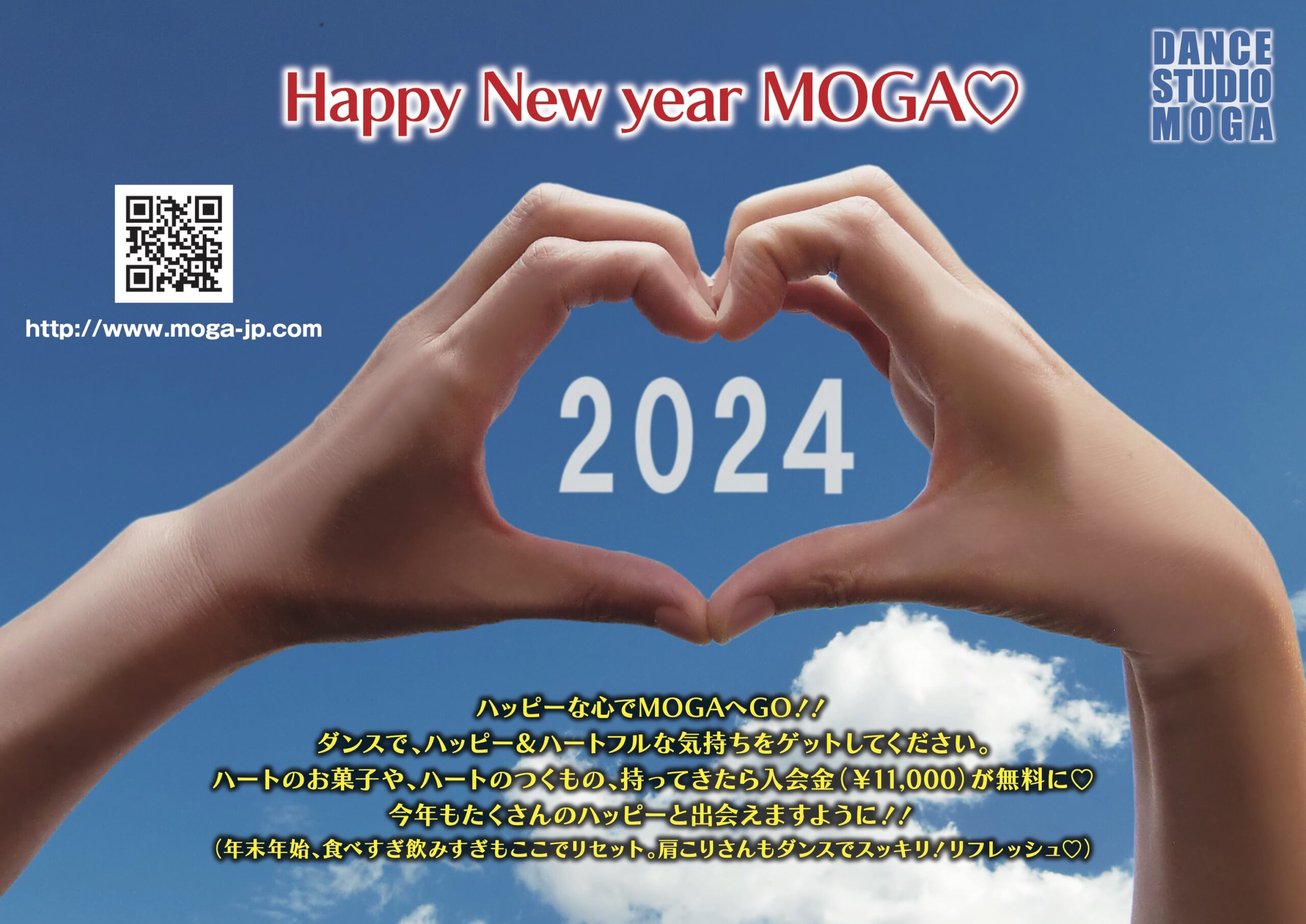 1月キャンペーンは「Happy New year MOGA♡」ハッピーな心でMOGAへGO!!ダンスで、ハッピー&ハートフルな気持ちをゲットしてください。ハートのお菓子や、ハートのつくもの、持ってきたら入会金(¥11,000)が無料に♡今年もたくさんのハッピーと出会えますように!!(年末年始、食べすぎ飲みすぎもここでリセット。肩こりさんもダンスでスッキリ!リフレッシュ♡)