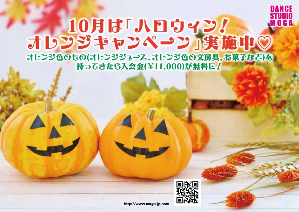 10月は「ハロウィン!オレンジキャンペーン」実施中!オレンジ色のもの(オレンジジュース、オレンジ色の文房具、お菓子など)を持ってきたら入会金(¥11,000)が無料に!今月もハッピーに踊っていきましょう♡