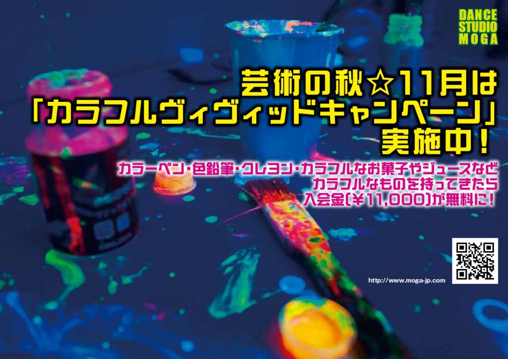 11月は「カラフルヴィヴィッドキャンペーン」実施中!カラーペン・色鉛筆・クレヨン・カラフルなお菓子など、カラフルなものを持ってきたら入会金(¥11,000)が無料に!今月もハッピーに踊っていきましょう♡